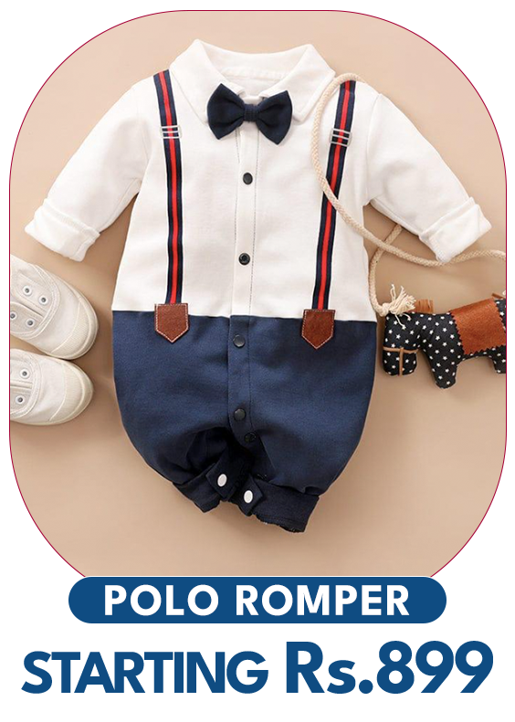 Plush-Polo Romper - White & Blue Contrast with Bowtie