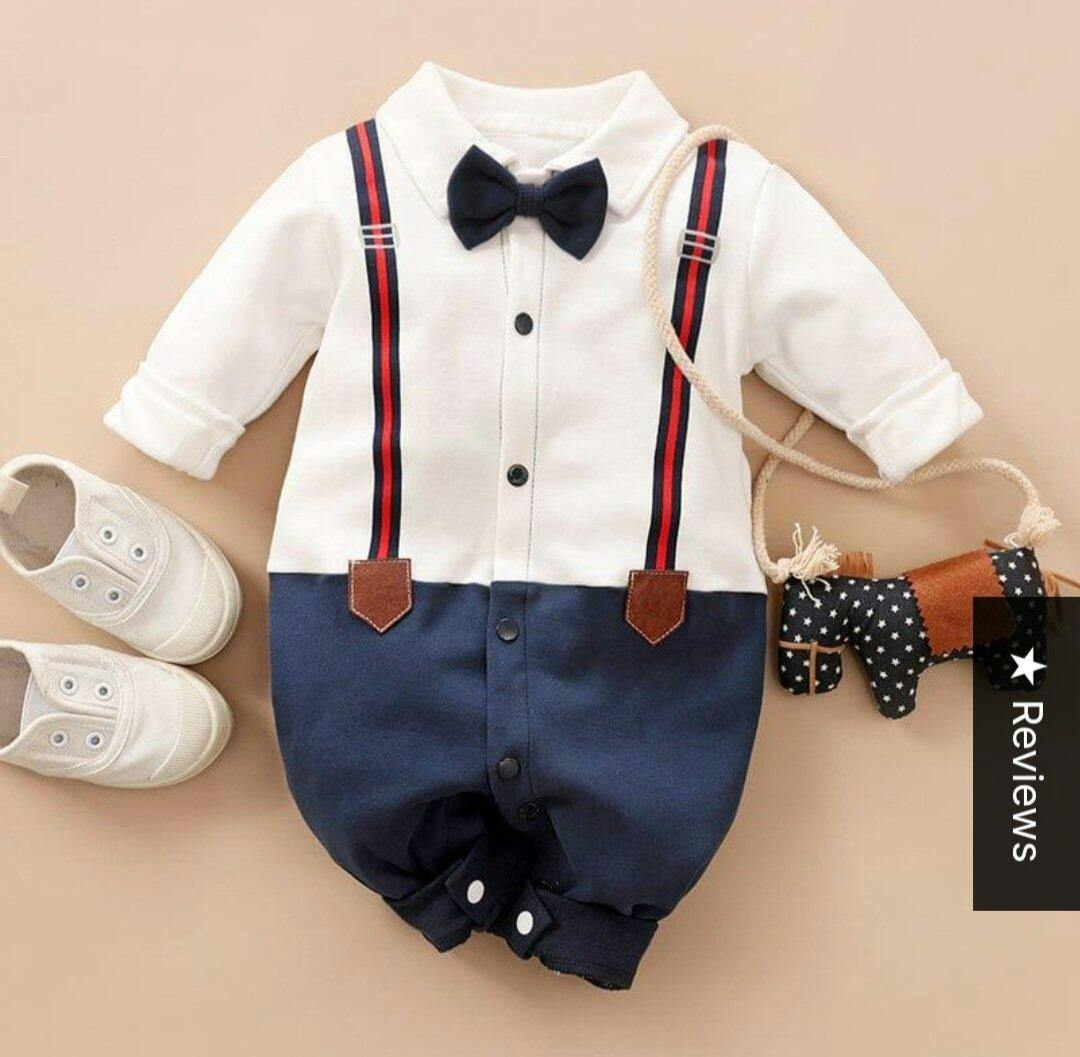 Plush-Polo Romper - White & Blue Contrast with Bowtie & Stripes